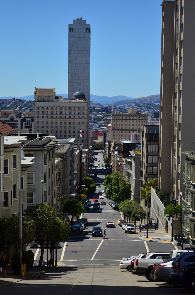 Trosc, zbang, weeeeee… pam pam pam pam vreo 28 de trepte. Deja le învăţasem şi le număram doar să văd că nu cumva se sare vreuna pentru că oricum angajaţii hotelului nu se dezic de la bunele obiceiuri nici acum în ultima zi. E 8 dimineaţa, normal şi e numai bine că a sunat „alarma” pe scări că oricum trebuia să plecăm devreme astăzi. Ducem bagajele la maşina parcată vis a vis de hotel şi când să ieşim să facem şi noi o manevră alla Bucharest pe linia continuă, fix în faţa noastră stă postat mândru şi rotofei, lângă motocicleta lui cu girofar, un nene posesor de gogoaşă şi pistol radar care-i „vâna” la greu pe vitezomanii matinali. Pleacă-n gogoaşa ta de aici că n-am pe unde să întorc…. nu pleacă, normal şi uite aşa facem turul de China Town ca să mai admirăm şi noi un pic San Francisco-ul înainte de a pleca.